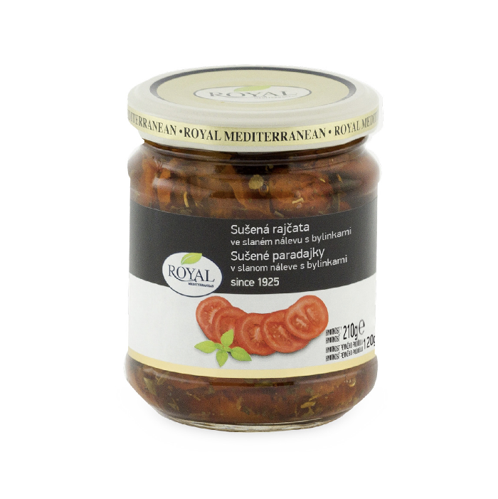Zrelé paradajky sušené na slnku, naložené v slanom náleve s bylinkami. Výborný doplnok do šalátov, cestovín, ku grilovanému mäsu alebo do sendvičov. Ideálne na podávanie s vínom.